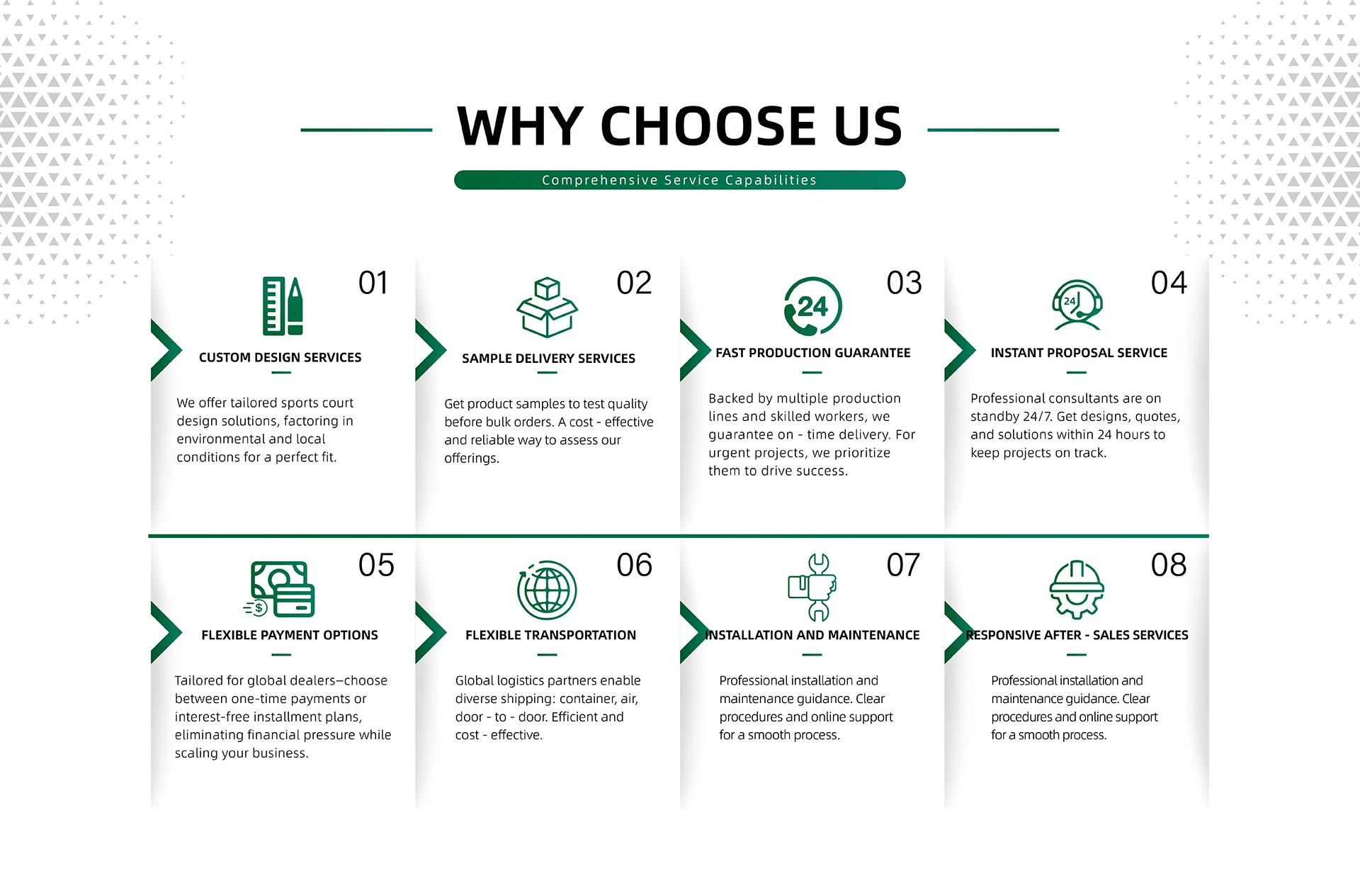 ผลิตภัณฑ์หลัก:สนามบาสเก็ตบอลสนามเทนนิสพื้นพีวีซีแบบกำหนดเองกระเบื้องปูพื้นโรงรถหญ้าเทียม